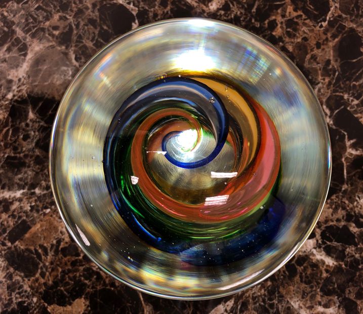 This aerial shot provides an interesting angle to observe not only the suspended air bubbles, but also an entirely new design. From above, the four "ribbons" converge into a vortex appearing to be perpetually in motion. Also, it's not every day that a "bird's eye view" quite literally looks like a bird's eye! The opening salvo of "The Life & Work of Henry Halladay" series was never going to be taken lightly. This established the level of craftsmanship, uniqueness and splendor early on, setting a high standard for the rest of the series to come.